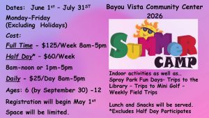 For more information, please contact the office at 985-395-6552 or stop by. We are located at 1333 Belleview Street in Bayou Vista.